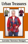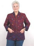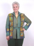 Hip length jacket in three views: the same shape and collar and all with a center front closures with the right and left front edges meeting in the center. View one has diagonal rectangle piecing with a front tie emerging from bound buttonholes at wait height; view two closes with a button tab joining the fronts at waist height; view three has diagonal strips ending at the waist with a contrast peplum below the waist, a zipper closure and three quarter length sleeves and contrast cuffs. All three views are lined.